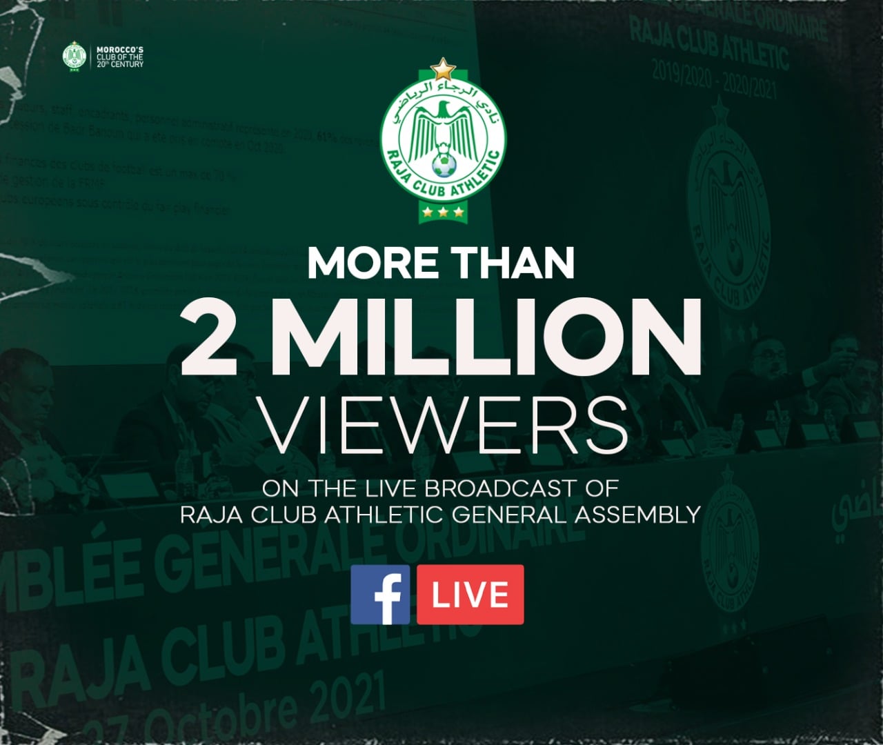 أعلنت الصفحة الرسمية لنادي الرجاء الرياضي أن عدد من تابعوا النقل المباشر للجمع العام للفريق الأخضر، الذي جرى أمس الأربعاء، قد تجاوز المليونين مشاهد.